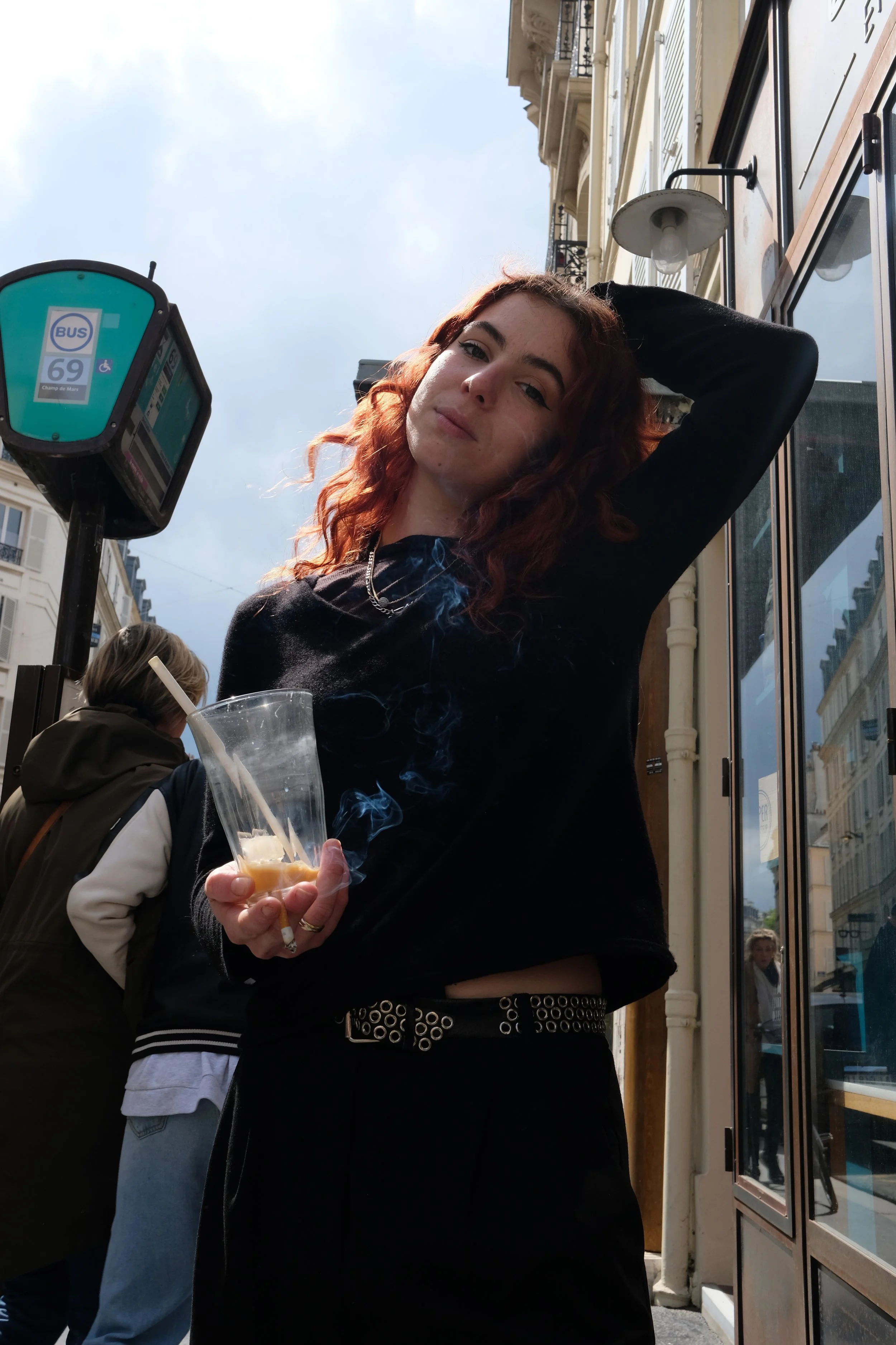 Hanaut wore an oversized sweater made of a black fuzzy fabric, and baggy black jeans with attached loops at the knees. The only spot of color she had was her recently dyed red shock of hair. She summarized her barista style as “not too classy but kind of put together.”